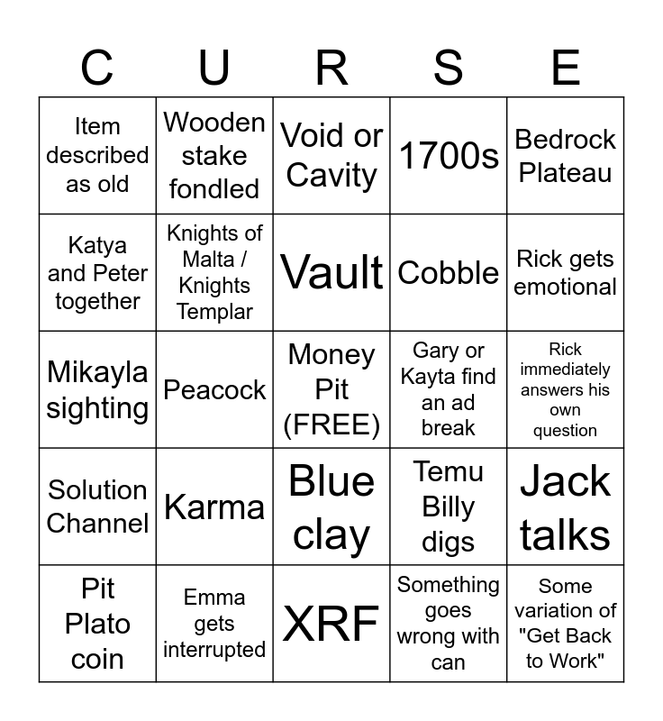 This bingo card has a free space and 24 words: Karma, Emma gets interrupted, Vault, Pit Plato coin, Bedrock Plateau, Item described as old, Katya and Peter together, Wooden stake fondled, Gary or Kayta find an ad break, Blue clay, Cobble, Mikayla sighting, Temu Billy digs, Jack talks, Knights of Malta / Knights Templar, Something goes wrong with can, Rick immediately answers his own question, Void or Cavity, Rick gets emotional, Peacock, Some variation of "Get Back to Work", Solution Channel, 1700s and XRF.