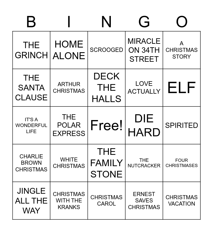 This bingo card has a free space and 25 words: WHITE CHRISTMAS, CHRISTMAS CAROL, DECK THE HALLS, JINGLE ALL THE WAY, A CHRISTMAS STORY, THE GRINCH, THE SANTA CLAUSE, HOME ALONE, DIE HARD, THE FAMILY STONE, LOVE ACTUALLY, IT'S A WONDERFUL LIFE, THE NUTCRACKER, FOUR CHRISTMASES, ARTHUR CHRISTMAS, FRED CLAUS, SPIRITED, SCROOGED, ELF, THE POLAR EXPRESS, CHRISTMAS VACATION, CHRISTMAS WITH THE KRANKS, CHARLIE BROWN CHRISTMAS, MIRACLE ON 34TH STREET and ERNEST SAVES CHRISTMAS.