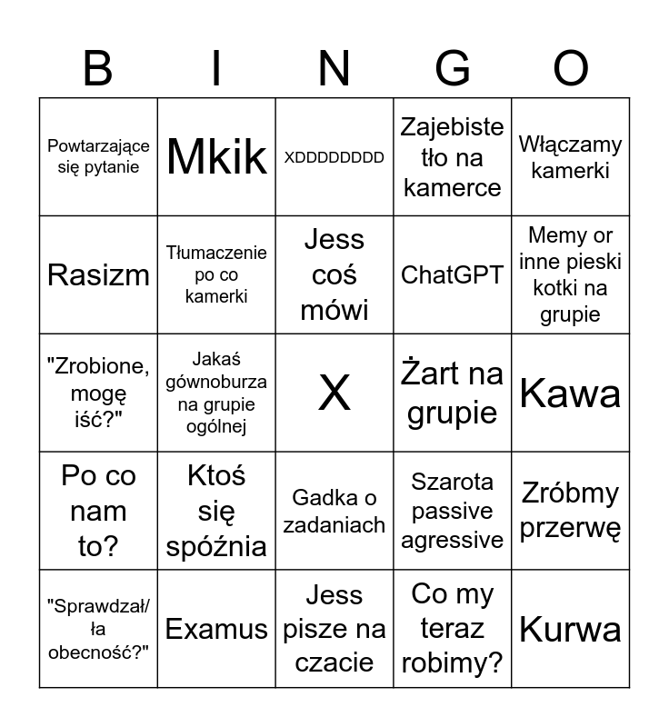 This bingo card has a free space and 24 words: Ktoś się spóźnia, Examus, Jess coś mówi, "Sprawdzał/ła obecność?", Włączamy kamerki, Powtarzające się pytanie, Rasizm, Mkik, Żart na grupie, Gadka o zadaniach, ChatGPT, "Zrobione, mogę iść?", Szarota passive agressive, Zróbmy przerwę, Tłumaczenie po co kamerki, Co my teraz robimy?, Kawa, XDDDDDDDD, Memy or inne pieski kotki na grupie, Jakaś gównoburza na grupie ogólnej, Kurwa, Po co nam to?, Zajebiste tło na kamerce and Jess pisze na czacie.