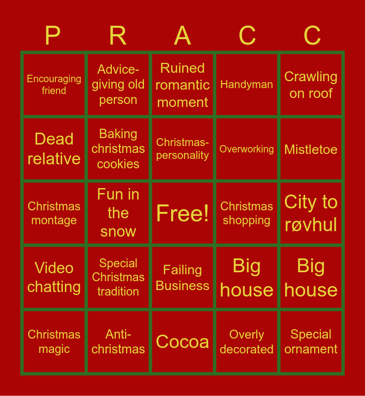 This bingo card has a free space and 27 words: Christmas magic, Anti-christmas, Christmas-personality, Overly decorated, Mistletoe, Encouraging friend, Advice-giving old person, Failing Business, Overworking, Special ornament, Christmas montage, Baking christmas cookies, Christmas boi, Big house, City to røvhul, Falling out/Christmas ruined, Fun in the snow, Ruined romantic moment, Christmas shopping, Crawling on roof, Video chatting, Special Christmas tradition, Cocoa, Handyman, Big house, Dead relative and Not since the accident.