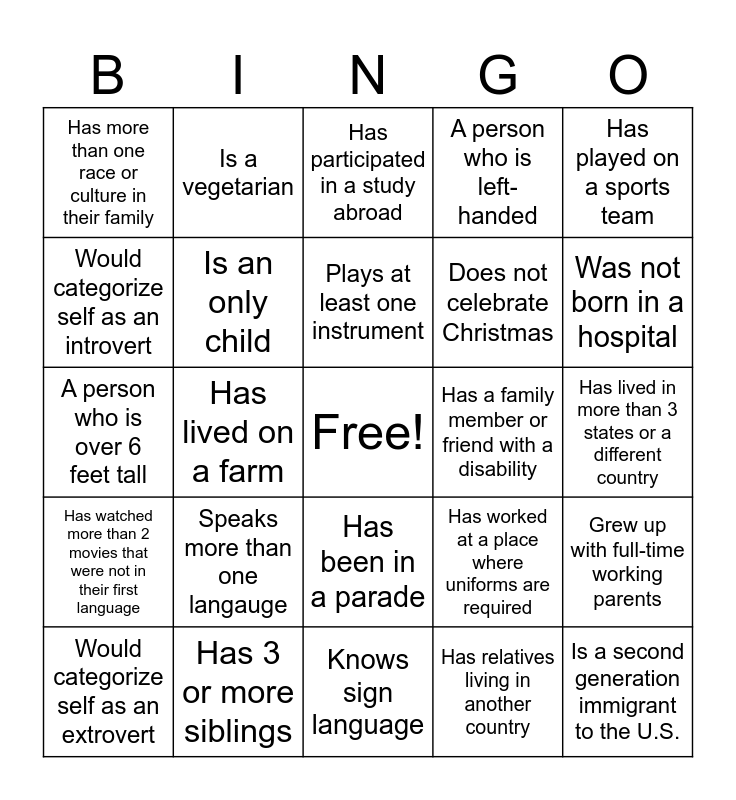 This bingo card has a free space and 24 words: Speaks more than one langauge, Has 3 or more siblings, Plays at least one instrument, Would categorize self as an extrovert, Has played on a sports team, Has more than one race or culture in their family, Would categorize self as an introvert, Is a vegetarian, Has a family member or friend with a disability, Has been in a parade, Does not celebrate Christmas, A person who is over 6 feet tall, Has worked at a place where uniforms are required, Grew up with full-time working parents, Is an only child, Has relatives living in another country, Has lived in more than 3 states or a different country, Has participated in a study abroad, Was not born in a hospital, Has lived on a farm, Is a second generation immigrant to the U.S., Has watched more than 2 movies that were not in their first language, A person who is left-handed and Knows sign language.
