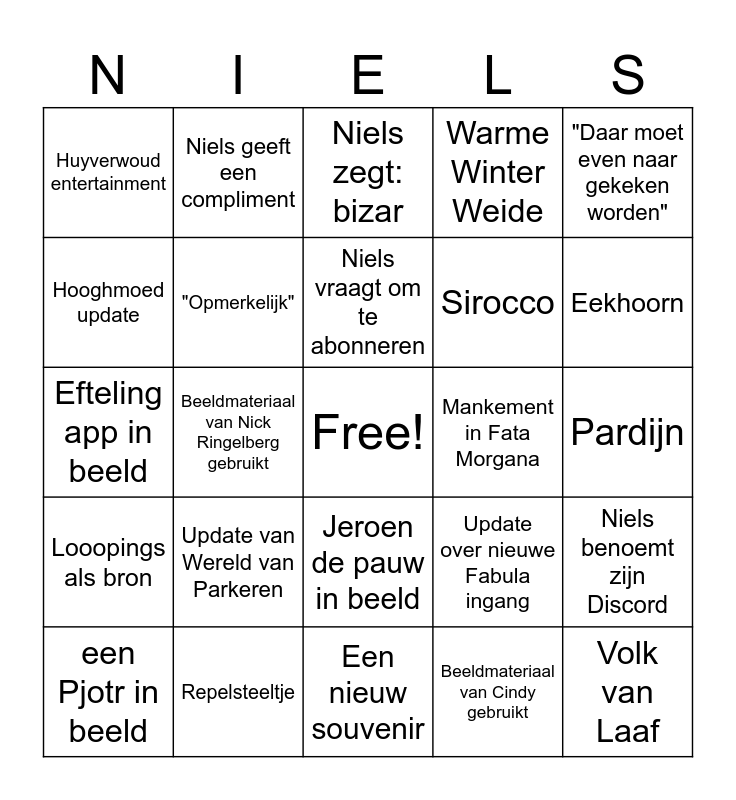 This bingo card has a free space and 32 words: Beeldmateriaal van Cindy gebruikt, Beeldmateriaal van Coshira gebruikt, Beeldmateriaal van Nick Ringelberg gebruikt, Eftepedia als bron, Looopings als bron, "Opmerkelijk", "Daar moet even naar gekeken worden", Niels benoemt zijn Discord, Niels geeft een compliment, Niels vraagt jouw mening, Niels vraagt om te abonneren, Niels zegt: bizar, Niels zegt: Slecht nieuws, Mankement in Symbolica, Mankement in Fata Morgana, Mankement in Carnaval Festival, een Pjotr in beeld, Efteling app in beeld, Jeroen de pauw in beeld, Update van Wereld van Parkeren, Update over nieuwe Fabula ingang, Pardoes, Pardijn, Repelsteeltje, Volk van Laaf, Warme Winter Weide, Sirocco, Hooghmoed update, Huyverwoud entertainment, Een nieuw souvenir, Lampje is kapot and Eekhoorn.