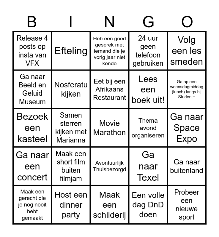 This bingo card has a free space and 24 words: Maak een short film buiten filmjam, Host een dinner party, Eet bij een Afrikaans Restaurant, Maak een gerecht die je nog nooit hebt gemaakt, Volg een les smeden, Release 4 posts op insta van VFX, Ga naar Beeld en Geluid Museum, Efteling, Thema avond organiseren, Avontuurlijk Thuisbezorgd, Lees een boek uit!, Bezoek een kasteel, Ga naar Texel, Ga naar buitenland, Nosferatu kijken, Een volle dag DnD doen, Ga naar Space Expo, Heb een goed gesprek met iemand die je vorig jaar niet kende, Ga op een woensdagmiddag (lunch) langs bij Student+, Samen sterren kijken met Marianna, Probeer een nieuwe sport, Ga naar een concert, 24 uur geen telefoon gebruiken and Maak een schilderij.