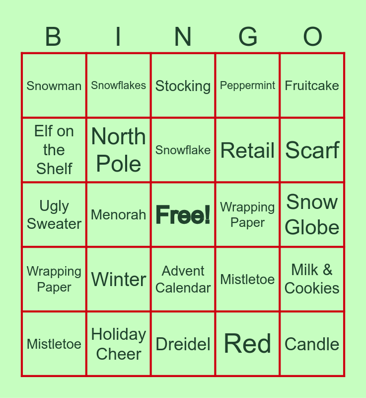 This bingo card has a free space and 104 words: Joy, Holiday Cards, Fruitcake, Black Friday Shopping, Holiday Movies, Holiday Baking, Outdoor Decorations, Holiday Lights, Wish List, Candy Canes, Wreath, Fireplace, Holiday Party, Presents, Hot Cocoa, Holiday weather, Stocking, Family and Friends, Caroling, Gift Exchange, Gingerbread House, Festive Pajamas, Holiday Photos, Holiday Music, Eggnog, Winter, Scarf, Peppermint, Noel, North Pole, Mistletoe, Red, Bells, Cold, Holiday Sweater, Traveling, Ornament, Holiday Socks, Snowflake, Holiday Cheer, Poinsettia, Wrapping Paper, Ice Skating, Elf on the Shelf, Holiday Festival, Snowman, Nutcracker, Candle, Ribbons and Bows, Mittens, Winter Olympics, new year, Gingerbread man, White Elephant, Deck the Halls, Gift bags, Ugly Sweater, Season of Giving, Winter vacation, Advent Calendar, Snow Globe, Stocking Stuffer, Gingerbread House, Reindeer, Candy Cane, Wreath, Eggnog, Snowflakes, Ugly Sweater, Menorah, Dreidel, Nutcracker, Presents, Holiday Pajamas, Christmas Tree, Holiday Mug, Poinsettia, Mistletoe, String Lights, Snowman, Elf on a Shelf, Hot Cocoa, North Pole, Ice Skating, Wrapping Paper, Grinch, Rudolph, Winter, Candle, Gifting, Holiday Baking, Ornament, Holiday Traditions, Milk & Cookies, Family & Friends, Noel, Ribbons & Bows, Retail, Giftcards, Lumps of Coal, Deck The Halls, Giving, Jingle Bells and Winter Wonderland.