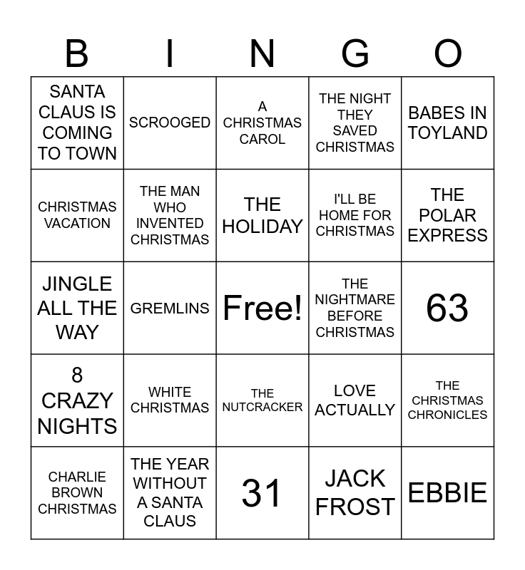 This bingo card has a free space and 101 words: 1, 16, 31, 46, 61, 2, 17, 32, 47, 62, 3, 18, 48, 63, 4, 19, 33, 49, 64, 5, 20, 34, 50, 65, ELF, WHITE CHRISTMAS, THE HOLIDAY, LOVE ACTUALLY, DIE HARD, SPIRITED, SCROOGED, A CHRISTMAS CAROL, MICKEY'S CHRISTMAS CAROL, THE GRINCH, CHARLIE BROWN CHRISTMAS, THE MUPPETS CHRISTMAS CAROL, HOME ALONE, HOME ALONE 2: LOST IN NEW YORK, THE POLAR EXPRESS, CHRISTMAS VACATION, THE SANTA CLAUSE, THE SANTA CLAUSE 2, THE SANTA CLAUSE 3, THE CHRISTMAS CHRONICLES, 8 CRAZY NIGHTS, 8-BIT CHRISTMAS, ERNEST SAVES CHRISTMAS, FOUR CHRISTMASES, ARTHUR CHRISTMAS, JINGLE ALL THE WAY, DECK THE HALLS, THE NUTCRACKER, JACK FROST, MIRACLE ON 34TH STREET, A CHRISTMAS STORY, NOELLE, KLAUS, THE NIGHT BEFORE, RED ONE, DEAR SANTA, THE MAN WHO INVENTED CHRISTMAS, FROSTY THE SNOWMAN, A VERY JONAS CHRISTMAS, CANDY CANE LANE, KRAMPUS, GREMLINS, BATMAN RETURNS, I'LL BE HOME FOR CHRISTMAS, BABES IN TOYLAND, HOLIDAY INN, RUDOLPH THE RED NOSED REINDEER, FRED CLAUS, THE NIGHT THEY SAVED CHRISTMAS, PREP AND LANDING, SANTA CLAUS IS COMING TO TOWN, THE YEAR WITHOUT A SANTA CLAUS, BAD SANTA, HARRY POTTER AND THE SORCERER'S STONE, OFFICE CHRISTMAS PARTY, MEET ME IN ST. LOUIS, SANTA PAWS, LITTLE WOMEN, THE NIGHTMARE BEFORE CHRISTMAS, EDWARD SCISSORHANDS, BAD MOMS CHRISTMAS, WHILE YOU WERE SLEEPING, CHRISTMAS IN CONNECTICUT, QUINCY'S QUEST, THE BEAR WHO SLEPT THROUGH CHRISTMAS, OLAF'S FROZEN ADVENTURE, ANY HALLMARK MOVIE, PRANCER, TRADING PLACES, A SNOW-WHITE CHRISTMAS, YOGI'S FIRST CHRISTMAS, EMMET OTTER, STAR WARS HOLIDAY SPECIAL (LIFE DAY), FROSTY RETURNS, EBBIE, THE PREACHER'S WIFE and BEAUTY AND THE BEAST: ENCHANTED CHRISTMAS.