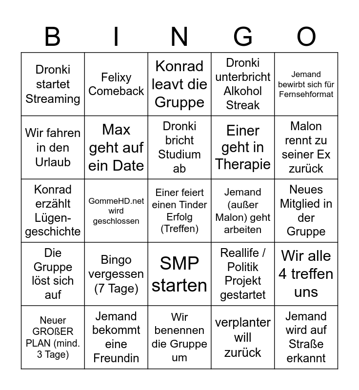This bingo card has a free space and 24 words: Bingo vergessen (7 Tage), Jemand bekommt eine Freundin, Dronki bricht Studium ab, Neuer GROßER PLAN (mind. 3 Tage), Jemand bewirbt sich für Fernsehformat, Dronki startet Streaming, Wir fahren in den Urlaub, Felixy Comeback, Jemand (außer Malon) geht arbeiten, SMP starten, Einer geht in Therapie, Konrad erzählt Lügen- geschichte, Reallife / Politik Projekt gestartet, Wir alle 4 treffen uns, Max geht auf ein Date, verplanter will zurück, Neues Mitglied in der Gruppe, Konrad leavt die Gruppe, Malon rennt zu seiner Ex zurück, GommeHD.net wird geschlossen, Jemand wird auf Straße erkannt, Die Gruppe löst sich auf, Dronki unterbricht Alkohol Streak and Wir benennen die Gruppe um.