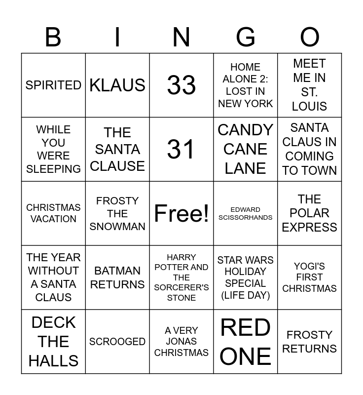 This bingo card has a free space and 104 words: 1, 16, 31, 46, 61, 2, 17, 32, 47, 62, 3, 18, 48, 63, 4, 19, 33, 49, 64, 5, 20, 34, 50, 65, THE MAN WHO INVENTED CHRISTMAS, FROSTY THE SNOWMAN, A VERY JONAS CHRISTMAS, CANDY CANE LANE, KRAMPUS, GREMLINS, BATMAN RETURNS, I'LL BE HOME FOR CHRISTMAS, BABES IN TOYLAND, HOLIDAY INN, RUDOLPH THE RED-NOSE REINDEER, FRED CLAUS, THE NIGHT THEY SAVED CHRISTMAS, PREP AND LANDING, SANTA CLAUS IN COMING TO TOWN, THE YEAR WITHOUT A SANTA CLAUS, BAD SANTA, HARRY POTTER AND THE SORCERER'S STONE, OFFICE CHRISTMAS PARTY, MEET ME IN ST. LOUIS, NOELLE, KLAUS, THE NIGHT BEFORE, RED ONE, DEAR SANTA, DECK THE HALLS, THE NUTCRACKER, JACK FROST, MIRACLE ON 34TH STREET, A CHRISTMAS STORY, 8 CRAZY NIGHTS, 8-BIT CHRISTMAS, ERNEST SAVES CHRISTMAS, FOUR CHRISTMASES, JINGLE ALL THE WAY, CHRISTMAS VACATION, THE SANTA CLAUSE, THE SANTA CLAUSE 2, THE SANTA CLAUSE 3, THE CHRISTMAS CHRONICLES, CHARLIE BROWN CHRISTMAS, A MUPPETS CHRISTMAS CAROL, HOME ALONE, HOME ALONE 2: LOST IN NEW YORK, THE POLAR EXPRESS, SPIRITED, SCROOGED, A CHRISTMAS CAROL, MICKEY'S CHRISTMAS CAROL, THE GRINCH, ELF, WHITE CHRISTMAS, THE HOLIDAY, LOVE ACTUALLY, DIE HARD, SANTA PAWS, LITTLE WOMEN, THE NIGHTMARE BEFORE CHRISTMAS, EDWARD SCISSORHANDS, BAD MOMS CHRISTMAS, WHILE YOU WERE SLEEPING, CHRISTMAS IN CONNECTICUT, QUINCY'S QUEST, THE BEAR WHO SLEPT THROUGH CHRISTMAS, OLAF'S FROZEN ADVENTURE, ANY HALLMARK MOVIE, PRANCER, TRADING PLACES, A SNOW-WHITE CHRISTMAS, YOGI'S FIRST CHRISTMAS, MR. MAGOO'S CHRISTMAS CAROL, HOT FROSTY, EMMET OTTER, STAR WARS HOLIDAY SPECIAL (LIFE DAY), FROSTY RETURNS, EBBIE, THE PREACHER'S WIFE, BEAUTY AND THE BEAST: ENCHANTED CHRISTMAS, DASHING THROUGH THE SNOW and SMOKY MOUNTAIN CHRISTMAS.