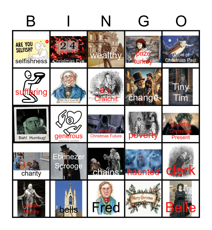 This bingo card has 25 images and 22 words: Ebenezer Scrooge, Fred, Bob Cratchit, Jacob Marley, Ghost of Christmas Past, selfishness, suffering, Christmas Eve, poverty, chains, change, haunted, clerk, Belle, Ghost of Chrismas Present, wealthy, Tiny Tim, generous, Ghost of Christmas Future, bells, charity and prize turkey.