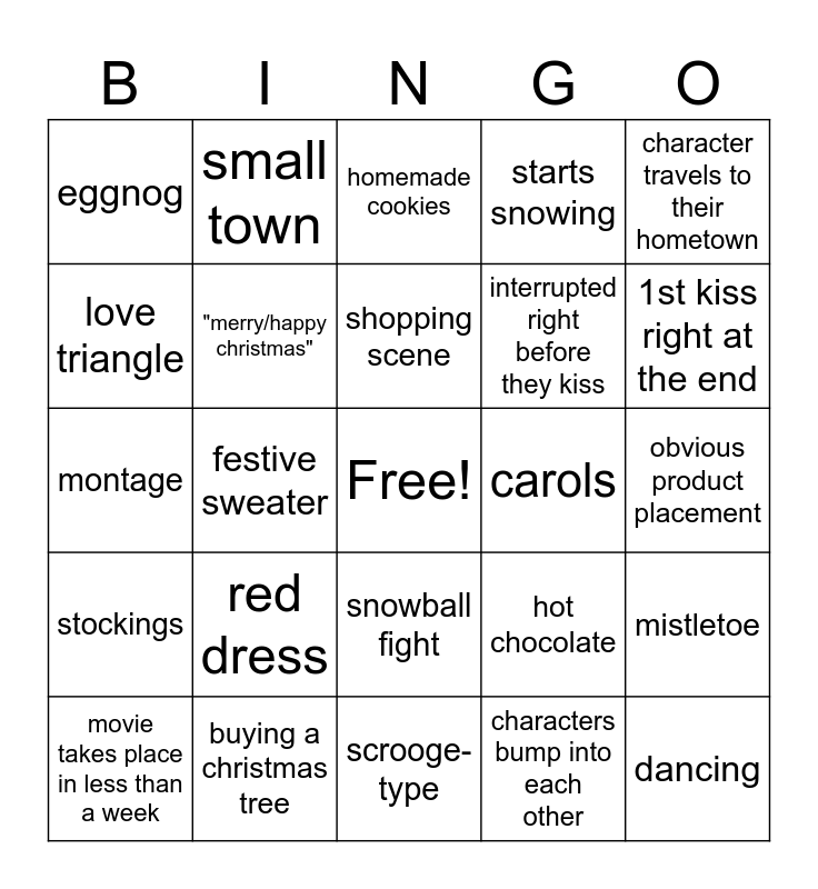 This bingo card has a free space and 50 words: couple declares love, dancing, epiphany, scrooge-type, red dress, ex shows up, small town, santa costume, love triangle, a wedding is stopped, "merry/happy christmas", starts snowing, mistletoe, hot chocolate, dead parent, former star actor, shopping scene, carols, particularly special ornament, character travels to their hometown, festive sweater, characters bump into each other, eggnog, interrupted right before they kiss, single parent, flannel/tartan, 1st kiss right at the end, falling over on ice/snow, homemade cookies, snowball fight, "the city", walk down the stairs dramatically, proposal, dog, buying a christmas tree, holding a mug in two hands, big misunderstanding, actors have zero chemistry, magic?, obvious product placement, british character, castle, nutcracker, horse and carriage, movie takes place in less than a week, montage, royalty, ice skating, stockings and character cries.
