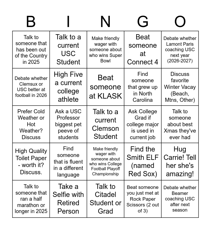 This bingo card has 50 words: Rock Paper Scissors with someone that has been to Ireland, Talk to a current Clemson Student, Tell a Smith Kid your favorite Disney ride, Talk to Citadel Student or Grad, Find someone that is fluent in a different language, Talk to someone that has a Golf handicap of 15 or better, Talk to a current USC Student, Ask current College Kid most "welcome to college" moment so far, Debate whether Clemsux or USC better at football in 2026, Talk to someone that has more than 1 dog, High Five a current college athlete, Beat someone at Connect 4, Hug Carrie! Tell her she's amazing!, Find the Smith ELF (named Red Sox), Get a stock tip from 2 people, Talk to a "movie star", Beat someone at KLASK, Ask College Grad if college major is used in current job, Found out the middle name of 3 people, Debate whether Lamont Paris coaching USC next year (2026-2027), Ask a USC Professor biggest pet peeve of students, Beat someone you just met at Rock Paper Scissors (2 out of 3), Talk to someone that has been out of the Country in 2025, Find someone that grew up in North Carolina, Debate whether Dabo Sweeney coaching Clemson after next season, Debate whether Beamer coaching USC after next season, Discuss favorite Winter Vacay (Beach, Mtns, Other), Drake "Drake May" May - Discuss if greatest of all time, Make friendly wager with someone about who wins Super Bowl, Make friendly wager with someone about who wins College Football Playoff Championship, Lane Kiffin: Villain? Discuss, Vote on Best Painting (Carrie or Cody), Coke or Pepsi? Debate, Talk to someone that plays a musical instrument, Take a Selfie with Retired Person, Debate who's going to win World Cup, Get new Movie recommendation from 2 people, Get new Show recommendation from 2 people, Talk to someone about last live music show they saw, Talk to someone about best Xmas they've ever had, Debate favorite Holiday with someone, Chess or Checkers? Discuss, Android or Apple? Discuss, Talk to someone that runs sub 7-minute mile (5k or better), Talk to someone that ran a half marathon or longer in 2025, Prefer Cold Weather or Hot Weather? Discuss, This Bingo Game is Fun - Yes or no? Discuss, Cody is a Loser? Discuss. (Taylor's suggestion), High Quality Toilet Paper - worth it? Discuss. and Sleep on your side, back or stomach? Discuss..