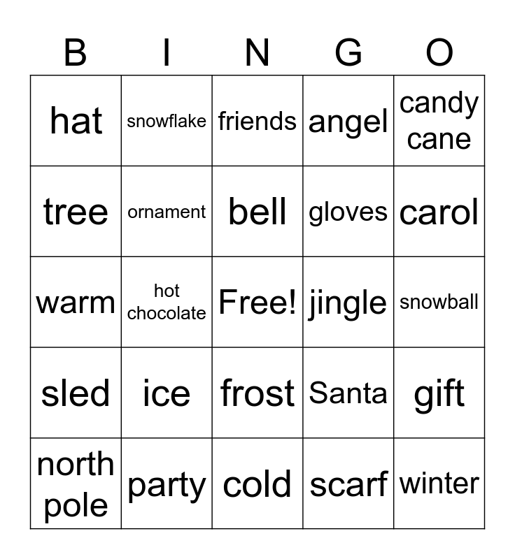 This bingo card has a free space and 52 words: snow, winter, Christmas, cold, ice, snowman, snowflake, holiday, tree, lights, ornament, present, gift, Santa, reindeer, sleigh, bell, jingle, stocking, candy cane, hot chocolate, scarf, hat, gloves, coat, boots, fireplace, chimney, carol, song, star, angel, wreath, mistletoe, family, friends, party, feast, cookies, pie, turkey, snowball, sled, skate, frost, freeze, icicle, warm, calendar, eve, north pole and elf.