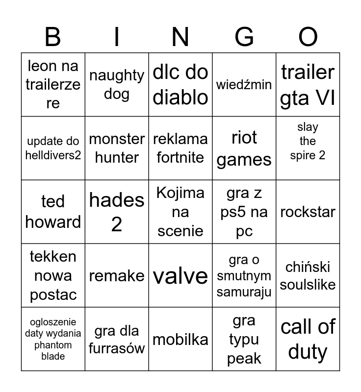 This bingo card has a free space and 24 words: remake, gra dla furrasów, reklama fortnite, ogloszenie daty wydania phantom blade, trailer gta VI, leon na trailerze re, update do helldivers2, naughty dog, gra z ps5 na pc, valve, riot games, ted howard, gra o smutnym samuraju, chiński soulslike, monster hunter, gra typu peak, rockstar, dlc do diablo, slay the spire 2, hades 2, call of duty, tekken nowa postac, wiedźmin and mobilka.