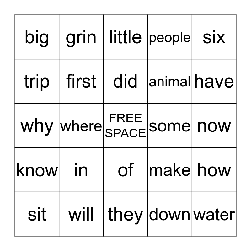 This bingo card has a free space and 24 words: in, will, did, sit, six, big, trip, grin, some, of, animal, why, make, how, first, down, now, little, have, where, water, know, people and they.