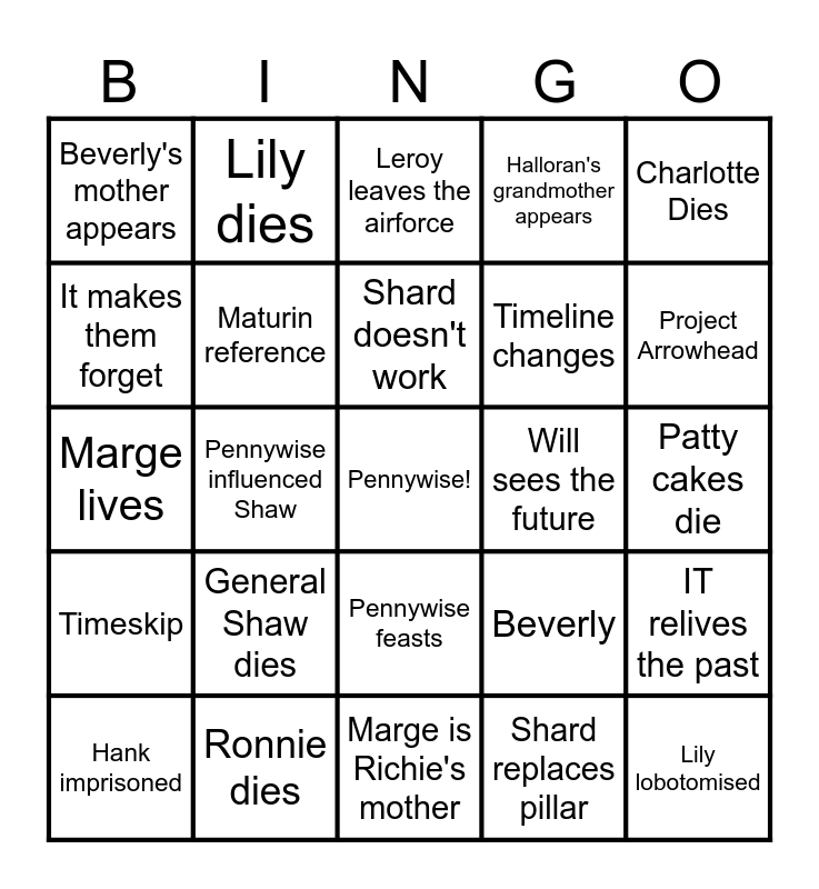 This bingo card has a free space and 24 words: General Shaw dies, Ronnie dies, Shard doesn't work, Hank imprisoned, Charlotte Dies, Beverly's mother appears, It makes them forget, Lily dies, Will sees the future, Pennywise feasts, Timeline changes, Marge lives, Beverly, IT relives the past, Maturin reference, Shard replaces pillar, Patty cakes die, Leroy leaves the airforce, Project Arrowhead, Pennywise influenced Shaw, Lily lobotomised, Timeskip, Halloran's grandmother appears and Marge is Richie's mother.