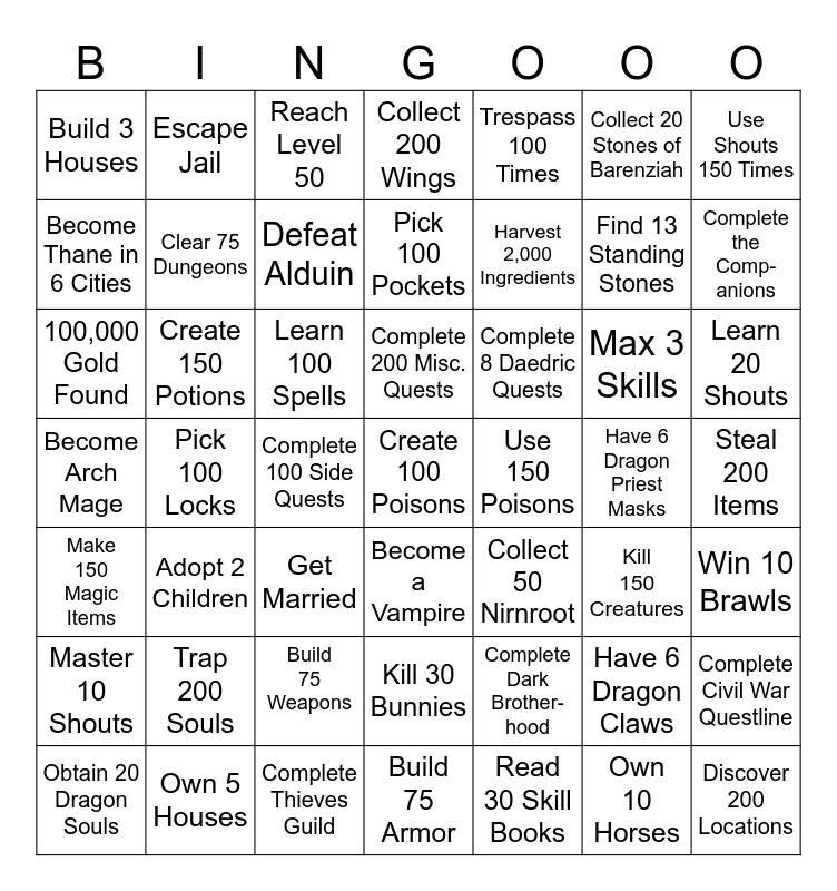 This bingo card has 49 words: Have 6 Dragon Claws, Find 13 Standing Stones, Read 30 Skill Books, Pick 100 Locks, Learn 100 Spells, Steal 200 Items, Escape Jail, Complete Thieves Guild, Collect 20 Stones of Barenziah, Become a Vampire, Use Shouts 150 Times, Collect 200 Wings, Max 3 Skills, Complete 8 Daedric Quests, Trap 200 Souls, Have 6 Dragon Priest Masks, Become Thane in 6 Cities, Complete the Comp-anions, Complete Civil War Questline, Trespass 100 Times, Harvest 2,000 Ingredients, Complete 100 Side Quests, Build 3 Houses, Clear 75 Dungeons, Obtain 20 Dragon Souls, Defeat Alduin, Learn 20 Shouts, Own 5 Houses, Complete 200 Misc. Quests, Create 150 Potions, Discover 200 Locations, Use 150 Poisons, Master 10 Shouts, Build 75 Weapons, Become Arch Mage, Collect 50 Nirnroot, Kill 150 Creatures, Win 10 Brawls, 100,000 Gold Found, Get Married, Kill 30 Bunnies, Make 150 Magic Items, Create 100 Poisons, Build 75 Armor, Pick 100 Pockets, Reach Level 50, Complete Dark Brother-hood, Adopt 2 Children and Own 10 Horses.