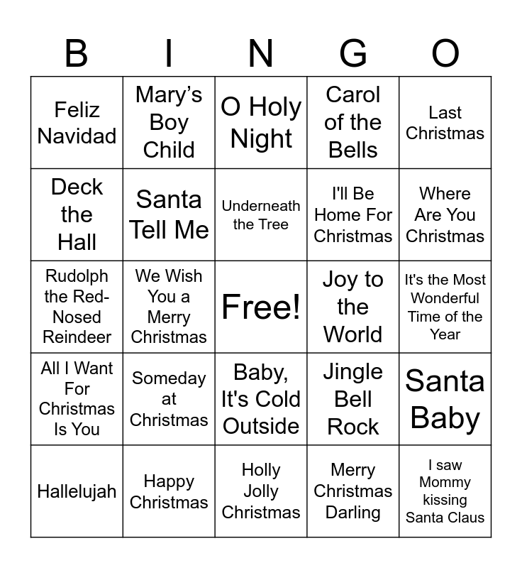 This bingo card has a free space and 54 words: 12 Days of Christmas, All I Want For Christmas Is You, Angels We Have Heard on High, Away in a Manger, Baby, It's Cold Outside, Blue Christmas, Carol of the Bells, Christmas in our Hearts, Deck the Hall, Do You Hear What I Hear?, Feliz Navidad, Frosty the Snowman, Happy Christmas, Hallelujah, Here Comes Santa Claus, Holly Jolly Christmas, I saw Mommy kissing Santa Claus, I'll Be Home For Christmas, It's Beginning to Look a Lot Like Christmas, It's the Most Wonderful Time of the Year, Jingle Bell Rock, Jingle Bells, Joy to the World, Last Christmas, Let It Snow, Maryβs Boy Child, Mary, Did You Know?, Mele Kalikimaka, Merry Christmas, Happy Holidays, Merry Christmas Darling, Mistletoe, My Only Wish (This Year), O Christmas Tree, O Come All Ye Faithful, O Holy Night, Rockin' Around the Christmas Tree, Rudolph the Red-Nosed Reindeer, Santa Baby, Santa Claus Is Coming to Town, Santa Tell Me, Sleigh Ride, Silent Night, Snowman, Silver Bells, Someday at Christmas, The First Noel, The Chipmunks Song (Christmas Donβt Be Late), The Christmas Song (Chestnuts Roasting on an open fire), Underneath the Tree, We Wish You a Merry Christmas, Where Are You Christmas, White Christmas, Winter Wonderland and You're A Mean One, Mr Grinch.