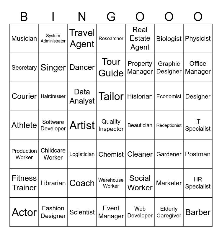This bingo card has 49 words: Marketer, Graphic Designer, Web Developer, Software Developer, Data Analyst, IT Specialist, System Administrator, Scientist, Biologist, Chemist, Physicist, Researcher, Economist, Historian, Librarian, Receptionist, Secretary, Office Manager, HR Specialist, Real Estate Agent, Property Manager, Artist, Musician, Singer, Actor, Dancer, Designer, Fashion Designer, Tailor, Hairdresser, Barber, Beautician, Fitness Trainer, Coach, Athlete, Cleaner, Gardener, Postman, Courier, Logistician, Warehouse Worker, Production Worker, Quality Inspector, Event Manager, Tour Guide, Travel Agent, Social Worker, Childcare Worker and Elderly Caregiver.