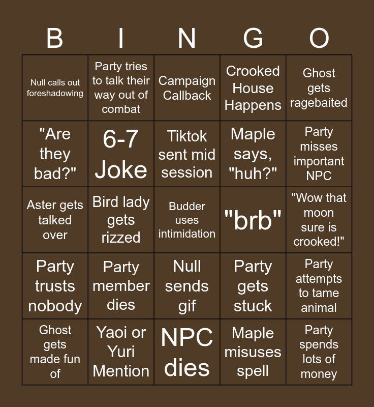 This bingo card has a free space and 24 words: Party member dies, Yaoi or Yuri Mention, Tiktok sent mid session, Ghost gets made fun of, Ghost gets ragebaited, Null calls out foreshadowing, "Are they bad?", Party tries to talk their way out of combat, "brb", Null sends gif, Maple says, "huh?", Aster gets talked over, Party gets stuck, Party attempts to tame animal, 6-7 Joke, Maple misuses spell, "Wow that moon sure is crooked!", Campaign Callback, Party misses important NPC, Bird lady gets rizzed, Party spends lots of money, Party trusts nobody, Crooked House Happens and NPC dies.