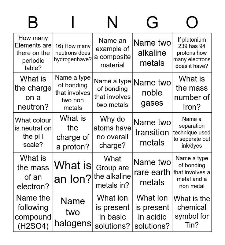 This bingo card has 25 words: What is an Ion?, What ion is present in basic solutions?, Name a type of bonding that involves two metals, Name the following compound (H2SO4), If plutonium 239 has 94 protons how many electrons does it have?, How many Elements are there on the periodic table?, What is the charge on a neutron?, 16) How many neutrons does hydrogenhave?, Name two transition metals, What Group are the alkaline metals in?, Name two noble gases, What colour is neutral on the pH scale?, Name two rare earth metals, Name a type of bonding that involves a metal and a non metal, Name a type of bonding that involves two non metals, What is the chemical symbol for Tin?, Name a separation technique used to seperate out ink/dyes, Name an example of a composite material, What is the mass number of Iron?, What is the charge of a proton?, Why do atoms have no overall charge?, Name two halogens, What is the mass of an electron?, Name two alkaline metals and What Ion is present in acidic solutions?.
