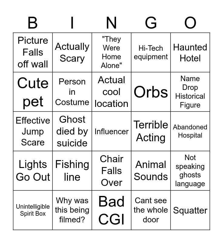 This bingo card has a free space and 46 words: Air currents, Squatter, Just their friend, Bad CGI, Fishing line, Sweep Cut, Actually Scary, Using their child, Cute pet, Inanimate Object that looks humanoid, Person in Costume, Hi-Tech equipment, Not speaking ghosts language, Animal Sounds, Perfect Camera Angle, Nightvision Camera, Actual cool location, Terrible Acting, Item thrown from off screen, Haunted Hotel, Ghost died by suicide, Cant see the whole door, Picture Falls off wall, Orbs, Red Circle, Name Drop Historical Figure, Unintelligible Spirit Box, 3:00 am, Chair Falls Over, Lights Go Out, Dash Cam Footage, Performing a Ritual, Lights in the Sky, Sped Up Footage, Unreliable Narrator, Why was this being filmed?, Abandoned Hospital, Red Arrow, Praying, Literally Nothing, Murder Victim Ghost, "They Were Home Alone", Effective Jump Scare, Burning Sage, Security Camera Footage and Japan.