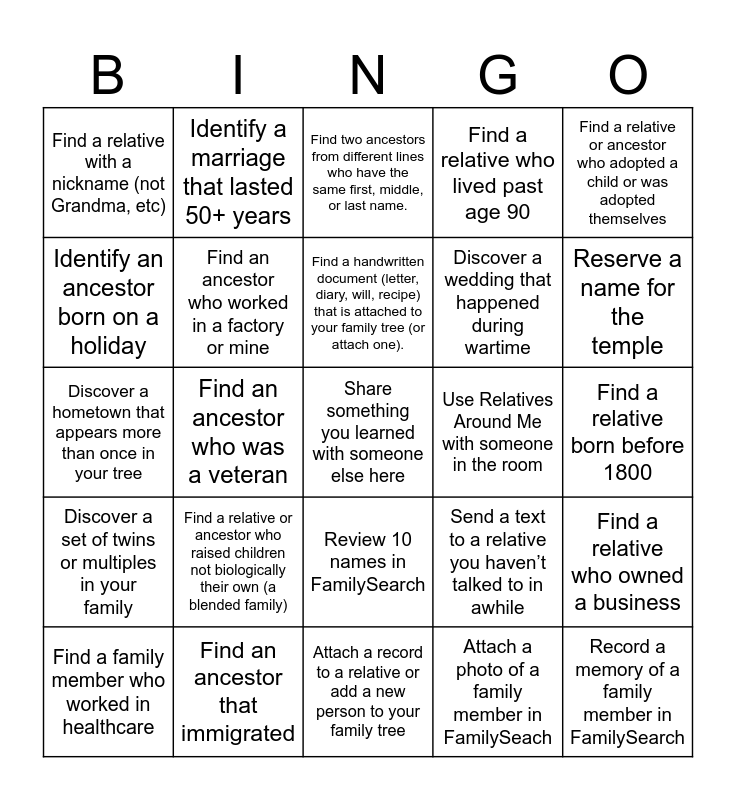 This bingo card has a free space and 30 words: Find an ancestor that immigrated, Put a unique family recipe on FamilySearch, Find an ancestor who was a veteran, Find a picture of a gravestone for a relative, Find a relative with a nickname (not Grandma, etc), Find two ancestors from different lines who have the same first, middle, or last name., Find an ancestor who worked in a factory or mine, Review 10 names in FamilySearch, Use Relatives Around Me with someone in the room, Attach a record to a relative or add a new person to your family tree, Find a relative born before 1800, Record a memory of a family member in FamilySearch, Attach a photo of a family member in FamilySeach, Read a story about a family member, Reserve a name for the temple, Find a relative that shares your first/middle name, Send a text to a relative you haven’t talked to in awhile, Discover a set of twins or multiples in your family, Find a relative or ancestor who raised children not biologically their own (a blended family), Find a relative or ancestor who adopted a child or was adopted themselves, Discover a hometown that appears more than once in your tree, Locate a place your family lived that no longer exists, Identify a marriage that lasted 50+ years, Discover a wedding that happened during wartime, Identify an ancestor born on a holiday, Find a relative who lived past age 90, Find a relative who owned a business, Find a family member who worked in healthcare, Find a handwritten document (letter, diary, will, recipe) that is attached to your family tree (or attach one). and Ask a relative to share a childhood memory.