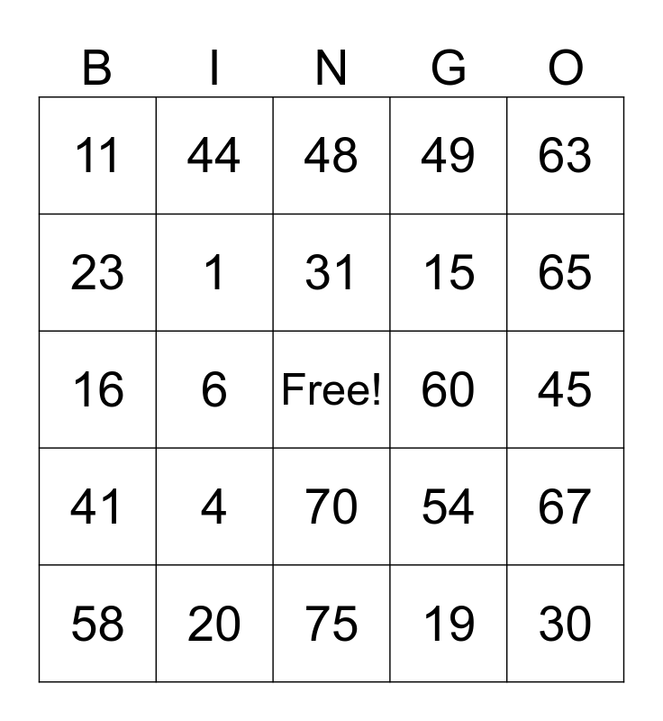 This bingo card has a free space and 24 words: 4, 20, 31, 58, 63, 11, 23, 44, 60, 70, 15, 16, 54, 67, 1, 19, 45, 48, 65, 6, 30, 41, 49 and 75.