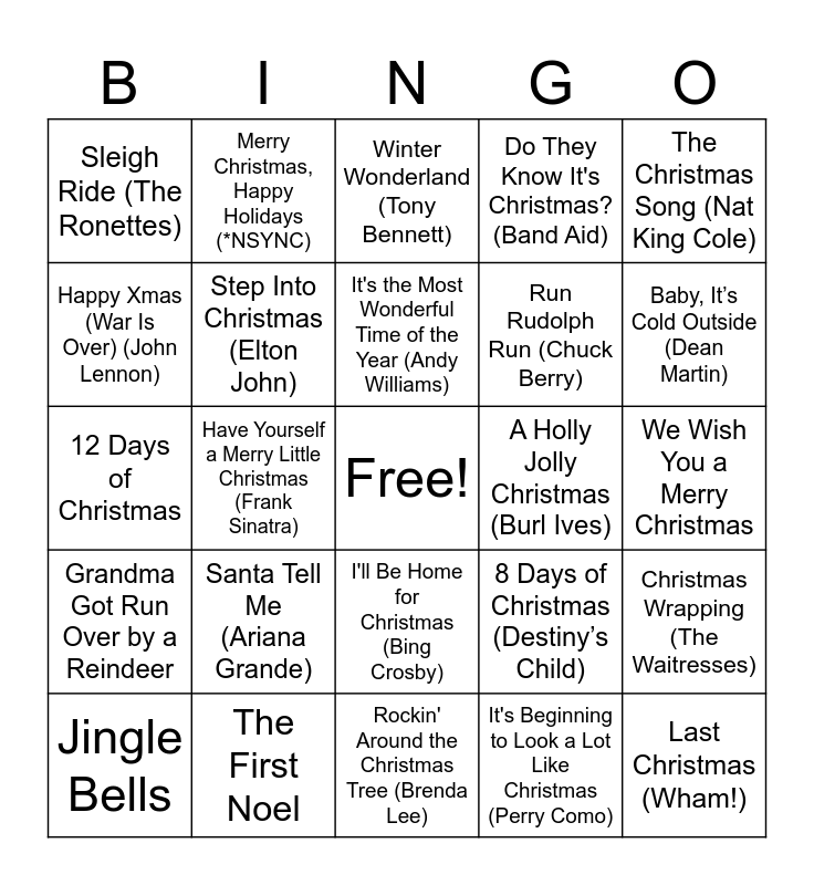 This bingo card has a free space and 50 words: All I Want for Christmas Is You (Mariah Carey), Last Christmas (Wham!), Jingle Bell Rock (Bobby Helms), Rockin' Around the Christmas Tree (Brenda Lee), Santa Tell Me (Ariana Grande), Underneath the Tree (Kelly Clarkson), Merry Christmas, Happy Holidays (*NSYNC), Mistletoe (Justin Bieber), Happy Xmas (War Is Over) (John Lennon), Wonderful Christmastime (Paul McCartney), Step Into Christmas (Elton John), Do They Know It's Christmas? (Band Aid), Christmas Wrapping (The Waitresses), 8 Days of Christmas (Destiny’s Child), Santa Baby (Eartha Kitt), White Christmas (Bing Crosby), It's the Most Wonderful Time of the Year (Andy Williams), A Holly Jolly Christmas (Burl Ives), Let It Snow! Let It Snow! Let It Snow! (Dean Martin), The Christmas Song (Nat King Cole), Have Yourself a Merry Little Christmas (Frank Sinatra), It's Beginning to Look a Lot Like Christmas (Perry Como), Sleigh Ride (The Ronettes), Run Rudolph Run (Chuck Berry), Blue Christmas (Elvis Presley), Mele Kalikimaka (Bing Crosby), Baby, It’s Cold Outside (Dean Martin), Feliz Navidad (José Feliciano), Winter Wonderland (Tony Bennett), I'll Be Home for Christmas (Bing Crosby), Silent Night, Joy to the World, O Holy Night, Hark! The Herald Angels Sing, The First Noel, Deck the Halls, The Little Drummer Boy, Carol of the Bells, O Come, All Ye Faithful, We Wish You a Merry Christmas, Do You Hear What I Hear?, Frosty the Snowman, Rudolph the Red-Nosed Reindeer, Here Comes Santa Claus, Jingle Bells, 12 Days of Christmas, Santa Claus Is Comin' to Town, Silver Bells, Grandma Got Run Over by a Reindeer and You're a Mean One, Mr. Grinch.
