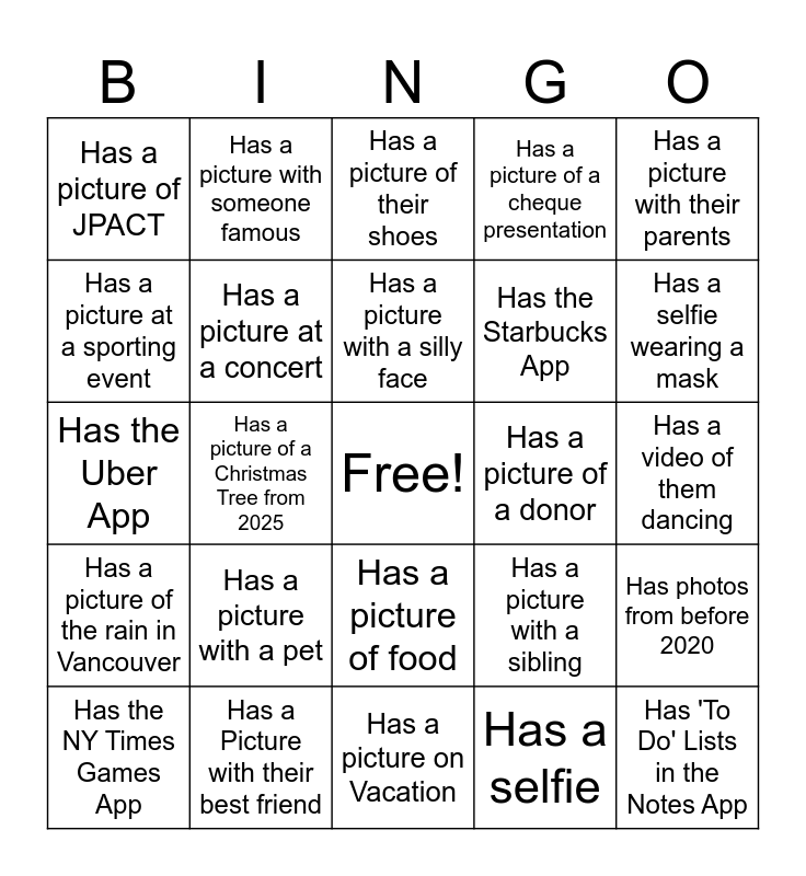 This bingo card has a free space and 24 words: Has a picture with a pet, Has a Picture with their best friend, Has a picture with a silly face, Has the NY Times Games App, Has a picture with their parents, Has a picture of JPACT, Has a picture at a sporting event, Has a picture with someone famous, Has a picture of a donor, Has a picture of food, Has the Starbucks App, Has the Uber App, Has a picture with a sibling, Has photos from before 2020, Has a picture at a concert, Has a selfie, Has a video of them dancing, Has a picture of their shoes, Has a selfie wearing a mask, Has a picture of a Christmas Tree from 2025, Has 'To Do' Lists in the Notes App, Has a picture of the rain in Vancouver, Has a picture of a cheque presentation and Has a picture on Vacation.