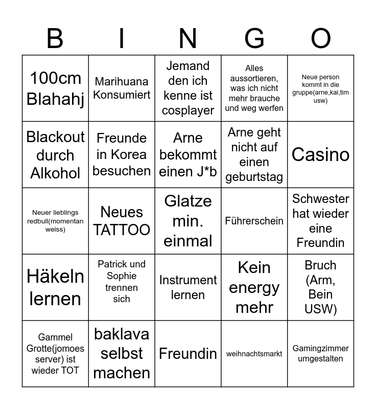 This bingo card has 25 words: Patrick und Sophie trennen sich, Freundin, Arne bekommt einen J*b, Gammel Grotte(jomoes server) ist wieder TOT, Neue person kommt in die gruppe(arne,kai,tim usw), 100cm Blahahj, Blackout durch Alkohol, Marihuana Konsumiert, Führerschein, Instrument lernen, Arne geht nicht auf einen geburtstag, Neuer lieblings redbull(momentan weiss), Kein energy mehr, Bruch (Arm, Bein USW), Freunde in Korea besuchen, Gamingzimmer umgestalten, Schwester hat wieder eine Freundin, Jemand den ich kenne ist cosplayer, Casino, Neues TATTOO, Glatze min. einmal, baklava selbst machen, Häkeln lernen, Alles aussortieren, was ich nicht mehr brauche und weg werfen and weihnachtsmarkt.