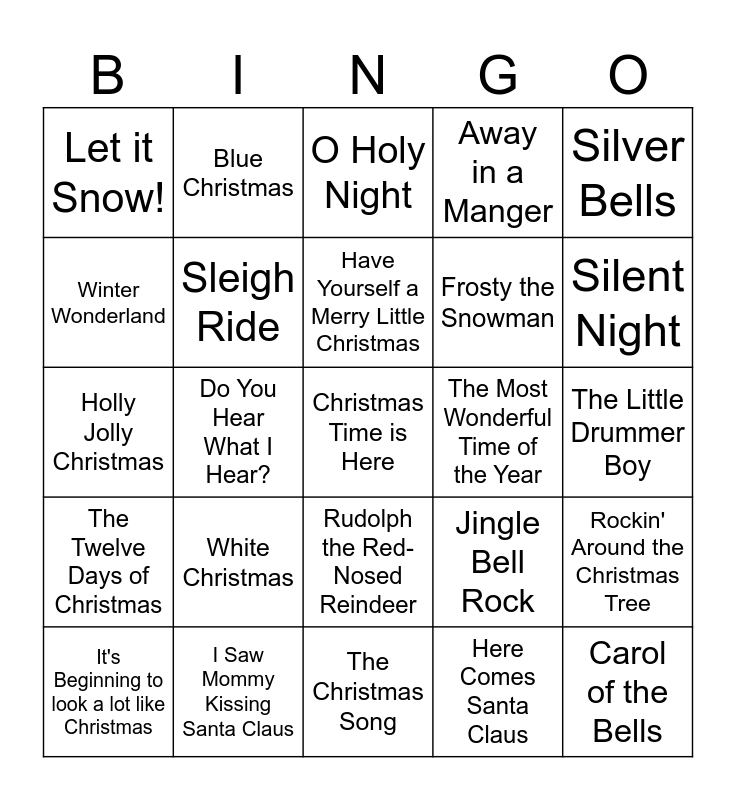 This bingo card has 25 words: White Christmas, The Christmas Song, Have Yourself a Merry Little Christmas, It's Beginning to look a lot like Christmas, Silver Bells, Let it Snow!, Winter Wonderland, Blue Christmas, The Most Wonderful Time of the Year, Rudolph the Red-Nosed Reindeer, Frosty the Snowman, Holly Jolly Christmas, Jingle Bell Rock, Rockin' Around the Christmas Tree, Sleigh Ride, Carol of the Bells, The Little Drummer Boy, O Holy Night, Silent Night, Do You Hear What I Hear?, Christmas Time is Here, I Saw Mommy Kissing Santa Claus, The Twelve Days of Christmas, Away in a Manger and Here Comes Santa Claus.