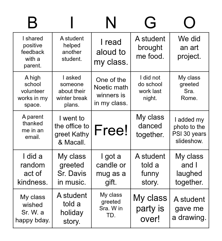 This bingo card has a free space and 44 words: Indoor recess, A student gave me a drawing., I got a heartfelt note from a parent., My class wished Sr. W. a happy bday., I got a gift card., My class party is over!, I read aloud to my class., I played a game with my class., We did an art project., A student told a holiday story., A student brought me food., My class danced together., I got a candle or mug as a gift., My class greeted Sr. Davis in music., My class greeted Sr. H in TD., My class greeted Sra. W in TD., All of my students are here today., A parent thanked me in an email., My class greeted Sra. Harris., My class greeted Sra. Rome., A student helped another student., I wrote a thank you note to a colleague., A student did a random act of kindness., I shared positive feedback with a parent., I had a conversation with a colleague I don't often see., I added my photo to the PSI 30 years slideshow., I complimented a colleague., Tell a joke!, A student told a funny story., I did a random act of kindness., I gave a student a high five., My class and I laughed together., My class could explain the music genre of the day., My class won Minute-to-Win-It at the assembly., I went to the office to greet Kathy & Macall., I thanked one of our custodians., I played with my students at recess., I read aloud to students twice in one day., One of the Noetic math winners is in my class., A high school volunteer works in my space., I did not do school work last night., I greeted a kitchen staff member., I asked someone about their winter break plans. and I'm ready for winter break!.