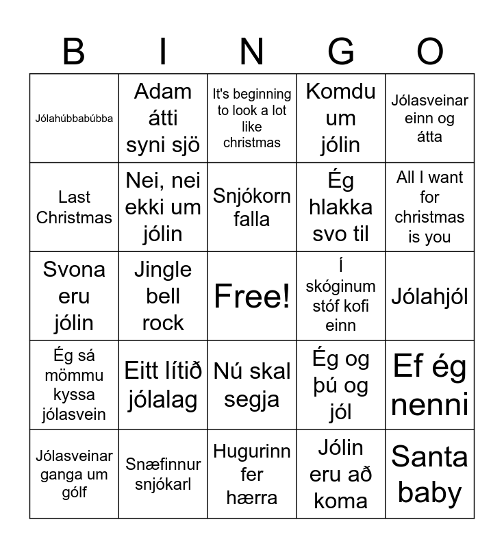 This bingo card has a free space and 24 words: Eitt lítið jólalag, Snæfinnur snjókarl, Snjókorn falla, Jólasveinar ganga um gólf, Jólasveinar einn og átta, Jólahúbbabúbba, Last Christmas, Adam átti syni sjö, Í skóginum stóf kofi einn, Nú skal segja, Ég hlakka svo til, Svona eru jólin, Ég og þú og jól, Ef ég nenni, Nei, nei ekki um jólin, Jólin eru að koma, Jólahjól, It's beginning to look a lot like christmas, All I want for christmas is you, Jingle bell rock, Santa baby, Ég sá mömmu kyssa jólasvein, Komdu um jólin and Hugurinn fer hærra.