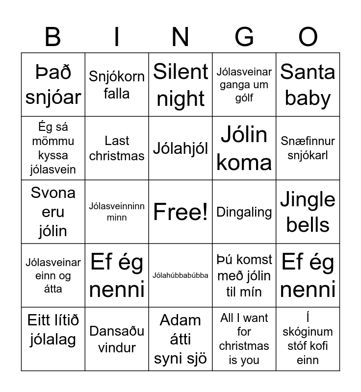 This bingo card has a free space and 24 words: Ef ég nenni, Dansaðu vindur, Jólahjól, Eitt lítið jólalag, Santa baby, Það snjóar, Ég sá mömmu kyssa jólasvein, Snjókorn falla, Dingaling, Jólahúbbabúbba, Jólin koma, Svona eru jólin, Þú komst með jólin til mín, Ef ég nenni, Last christmas, All I want for christmas is you, Jingle bells, Silent night, Snæfinnur snjókarl, Jólasveinninn minn, Í skóginum stóf kofi einn, Jólasveinar einn og átta, Jólasveinar ganga um gólf and Adam átti syni sjö.