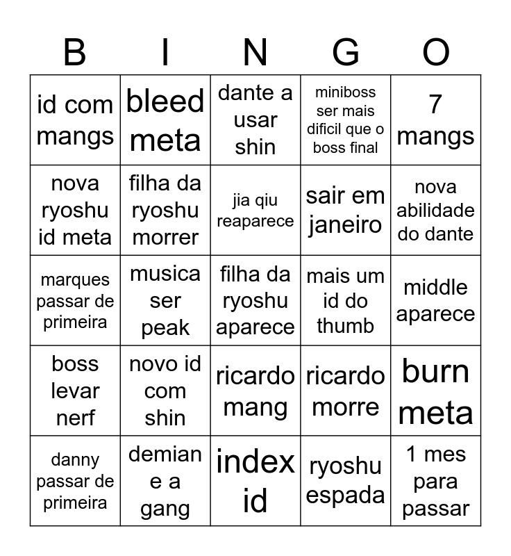This bingo card has a free space and 26 words: ricardo mang, ryoshu espada, jia qiu reaparece, demian e a gang, 7 mangs, id com mangs, nova ryoshu id meta, bleed meta, middle aparece, ricardo morre, sair em janeiro, marques passar de primeira, burn meta, danny passar de primeira, musica ser peak, novo id do gregor bom, miniboss ser mais dificil que o boss final, boss levar nerf, dante a usar shin, 1 mes para passar, nova abilidade do dante, index id, mais um id do thumb, novo id com shin, filha da ryoshu morrer and nova lore dos sindicatos.