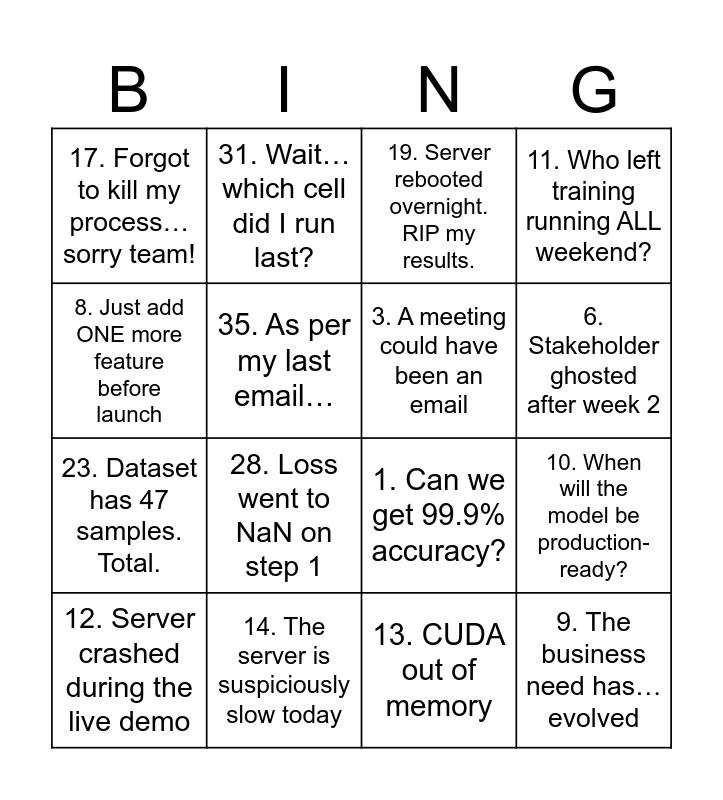 This bingo card has 41 words: Free!, 1. Can we get 99.9% accuracy?, 2. Actually, let’s pivot the entire approach, 3. A meeting could have been an email, 4. Requirements changed… again, 5. Can we make it real-time?, 6. Stakeholder ghosted after week 2, 7. This should be simple, right?, 8. Just add ONE more feature before launch, 9. The business need has… evolved, 10. When will the model be production-ready?, 11. Who left training running ALL weekend?, 12. Server crashed during the live demo, 13. CUDA out of memory, 14. The server is suspiciously slow today, 15. Someone hogged all GPUs, 16. OOM killed at epoch 99 of 100, 17. Forgot to kill my process… sorry team!, 18. SSH connection died mid-experiment, 19. Server rebooted overnight. RIP my results., 20. We need more data, 21. The labels are completely wrong, 22. Who annotated this?!, 23. Dataset has 47 samples. Total., 24. The data is too noisy to use, 25. Extreme class imbalance strikes again, 26. Test data leaked into training set, 27. Ground truth isn’t actually true, 28. Loss went to NaN on step 1, 29. Works perfectly on my machine, 30. Forgot to shuffle the dataset, 31. Wait… which cell did I run last?, 32. Jupyter kernel died mysteriously, 33. Restart kernel, run all, pray, 34. This notebook is 2000 cells long, 35. As per my last email…, 36. “Quick 5-min sync” = 45 minutes, 37. I’ll document this later, 38. Nice pajama top on the call, 39. Pet photobombed the video call and 40. Internet died at demo time.
