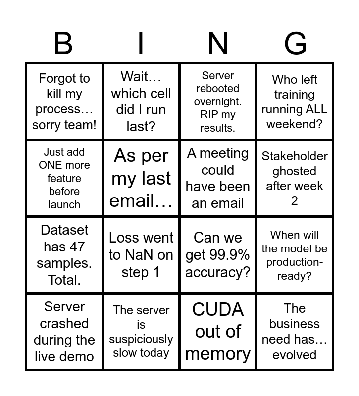 This bingo card has 41 words: Free!, Can we get 99.9% accuracy?, Actually, let’s pivot the entire approach, A meeting could have been an email, Requirements changed… again, Can we make it real-time?, Stakeholder ghosted after week 2, This should be simple, right?, Just add ONE more feature before launch, The business need has… evolved, When will the model be production-ready?, Who left training running ALL weekend?, Server crashed during the live demo, CUDA out of memory, The server is suspiciously slow today, Someone hogged all GPUs, OOM killed at epoch 99 of 100, Forgot to kill my process… sorry team!, SSH connection died mid-experiment, Server rebooted overnight. RIP my results., We need more data, The labels are completely wrong, Who annotated this?!, Dataset has 47 samples. Total., The data is too noisy to use, Extreme class imbalance strikes again, Test data leaked into training set, Ground truth isn’t actually true, Loss went to NaN on step 1, Works perfectly on my machine, Forgot to shuffle the dataset, Wait… which cell did I run last?, Jupyter kernel died mysteriously, Restart kernel, run all, pray, This notebook is 2000 cells long, As per my last email…, “Quick 5-min sync” = 45 minutes, I’ll document this later, Nice pajama top on the call, Pet photobombed the video call and Internet died at demo time.