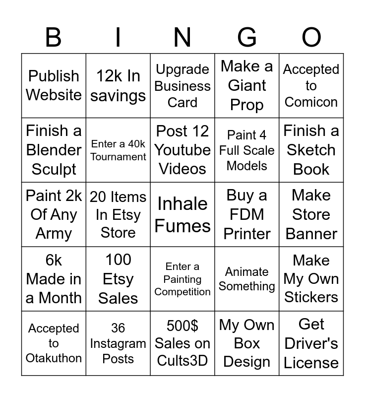 This bingo card has a free space and 24 words: 100 Etsy Sales, 36 Instagram Posts, Post 12 Youtube Videos, Accepted to Otakuthon, Accepted to Comicon, Publish Website, Finish a Blender Sculpt, 12k In savings, Buy a FDM Printer, Enter a Painting Competition, Paint 4 Full Scale Models, Paint 2k Of Any Army, Animate Something, Make My Own Stickers, Enter a 40k Tournament, My Own Box Design, Make Store Banner, Upgrade Business Card, Finish a Sketch Book, 20 Items In Etsy Store, Get Driver's License, 6k Made in a Month, Make a Giant Prop and 500$ Sales on Cults3D.