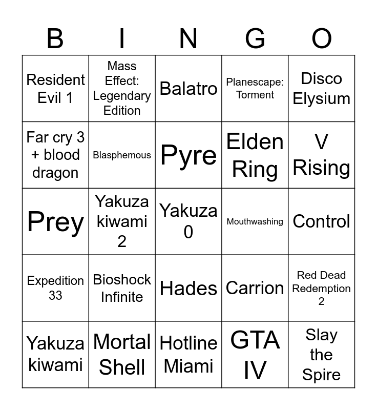 This bingo card has a free space and 24 words: Bioshock Infinite, Mortal Shell, Pyre, Yakuza kiwami, Disco Elysium, Resident Evil 1, Far cry 3 + blood dragon, Mass Effect: Legendary Edition, Mouthwashing, Hades, Elden Ring, Prey, Carrion, Red Dead Redemption 2, Blasphemous, GTA IV, Control, Balatro, V Rising, Yakuza kiwami 2, Slay the Spire, Expedition 33, Planescape: Torment and Hotline Miami.