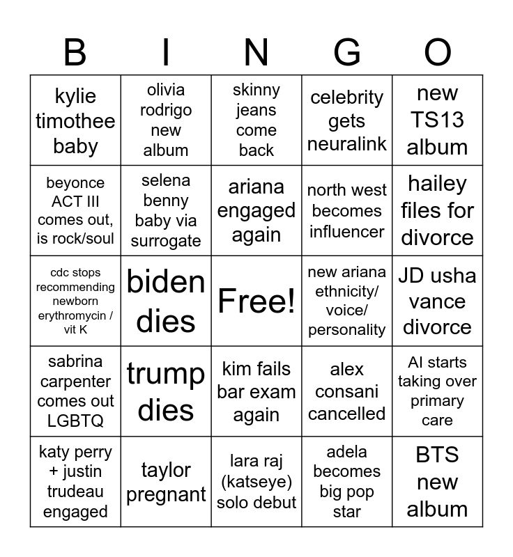 This bingo card has a free space and 24 words: trump dies, taylor pregnant, ariana engaged again, katy perry + justin trudeau engaged, new TS13 album, kylie timothee baby, beyonce ACT III comes out, is rock/soul, olivia rodrigo new album, new ariana ethnicity/ voice/ personality, kim fails bar exam again, north west becomes influencer, cdc stops recommending newborn erythromycin / vit K, alex consani cancelled, AI starts taking over primary care, selena benny baby via surrogate, adela becomes big pop star, JD usha vance divorce, skinny jeans come back, hailey files for divorce, biden dies, BTS new album, sabrina carpenter comes out LGBTQ, celebrity gets neuralink and lara raj (katseye) solo debut.