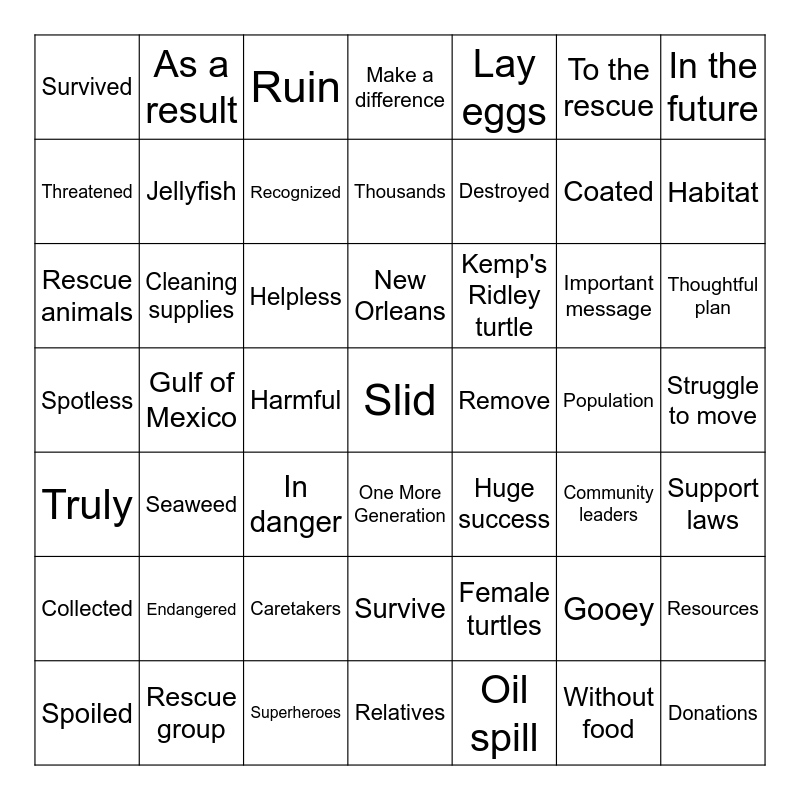 This bingo card has 49 words: Gooey, Coated, Oil spill, Gulf of Mexico, Helpless, Struggle to move, As a result, Superheroes, To the rescue, One More Generation, In the future, Make a difference, Important message, Kemp's Ridley turtle, Endangered, Population, Threatened, Habitat, Resources, Lay eggs, Destroyed, Harmful, Survived, Jellyfish, Spoiled, Recognized, Thoughtful plan, Rescue group, New Orleans, Cleaning supplies, Donations, Remove, Collected, Caretakers, Spotless, Huge success, Community leaders, Support laws, Rescue animals, In danger, Survive, Truly, Slid, Relatives, Thousands, Ruin, Female turtles, Seaweed and Without food.