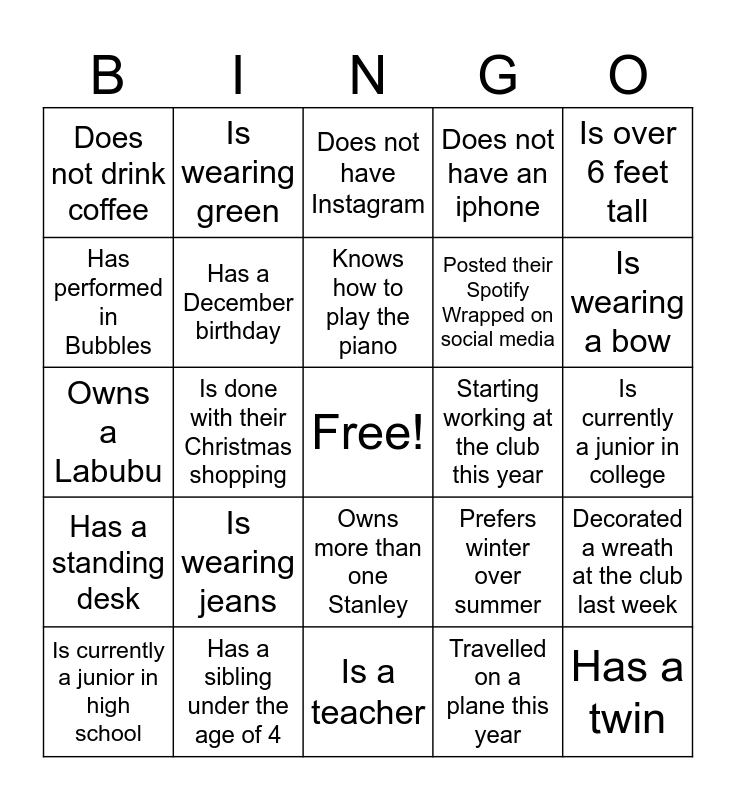 This bingo card has a free space and 33 words: Is wearing red, Has never had a pet, Is done with their Christmas shopping, Is engaged, Has a standing desk, Has a December birthday, Is over 6 feet tall, Is currently a junior in high school, Is wearing green, Has never done karaoke, Knows how to play the piano, Does not have Instagram, Has travelled to more than 15 countries, Wears the same size shoe as you, Starting working at the club this year, Is wearing a bow, Has a sibling under the age of 4, Owns a Labubu, Is wearing jeans, Prefers winter over summer, Owns more than one Stanley, Has run a marathon, Does not drink coffee, Is currently a junior in college, Is a teacher, Has a twin, Does not have an iphone, Posted their Spotify Wrapped on social media, Has performed in Bubbles, Decorated a wreath at the club last week, Is related to someone else who works at the club, Travelled on a plane this year and Read more than 20 books this year.