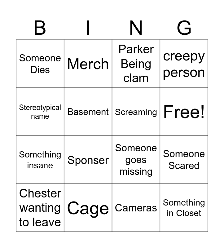 This bingo card has 17 words: Cameras, Chester wanting to leave, Parker Being clam, Someone Dies, Sponser, creepy person, Someone Scared, Screaming, Free!, Basement, Cage, Someone goes missing, Stereotypical name, Merch, Something insane, Weird voice and Something in Closet.