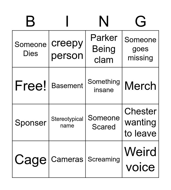 This bingo card has 16 words: Cameras, Chester wanting to leave, Parker Being clam, Someone Dies, Sponser, creepy person, Someone Scared, Screaming, Free!, Basement, Cage, Someone goes missing, Stereotypical name, Merch, Something insane and Weird voice.