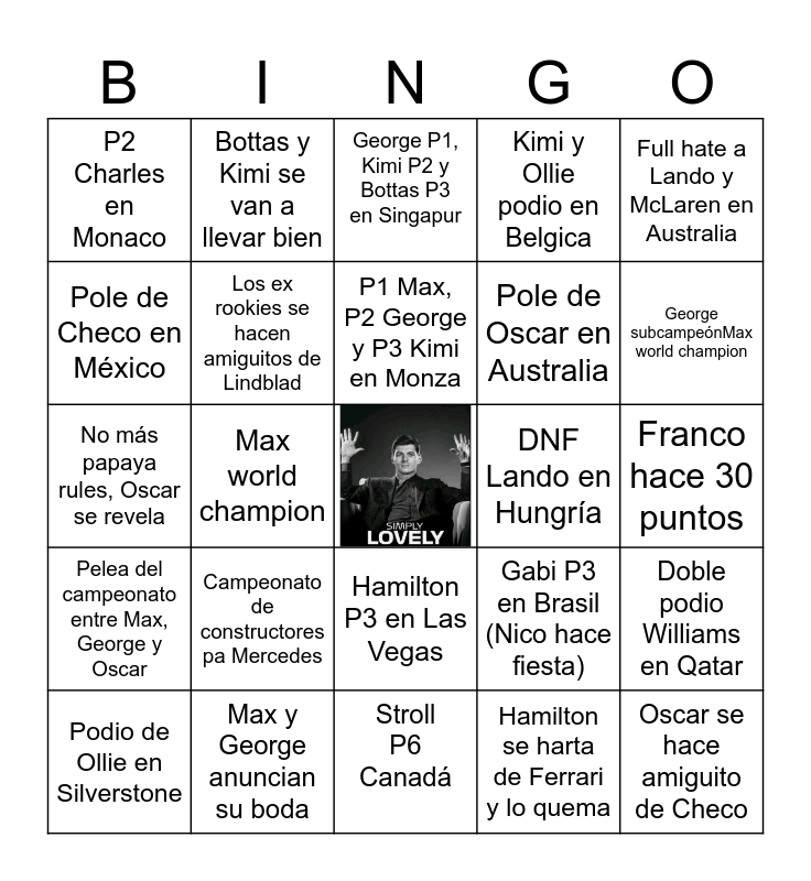 This bingo card has a free space and 24 words: Campeonato de constructores pa Mercedes, Max y George anuncian su boda, P1 Max, P2 George y P3 Kimi en Monza, Podio de Ollie en Silverstone, Full hate a Lando y McLaren en Australia, P2 Charles en Monaco, Pole de Checo en México, Bottas y Kimi se van a llevar bien, DNF Lando en Hungría, Hamilton P3 en Las Vegas, Pole de Oscar en Australia, No más papaya rules, Oscar se revela, Gabi P3 en Brasil (Nico hace fiesta), Doble podio Williams en Qatar, Los ex rookies se hacen amiguitos de Lindblad, Hamilton se harta de Ferrari y lo quema, Franco hace 30 puntos, George P1, Kimi P2 y Bottas P3 en Singapur, George subcampeónMax world champion, Max world champion, Oscar se hace amiguito de Checo, Pelea del campeonato entre Max, George y Oscar, Kimi y Ollie podio en Belgica and Stroll P6 Canadá.