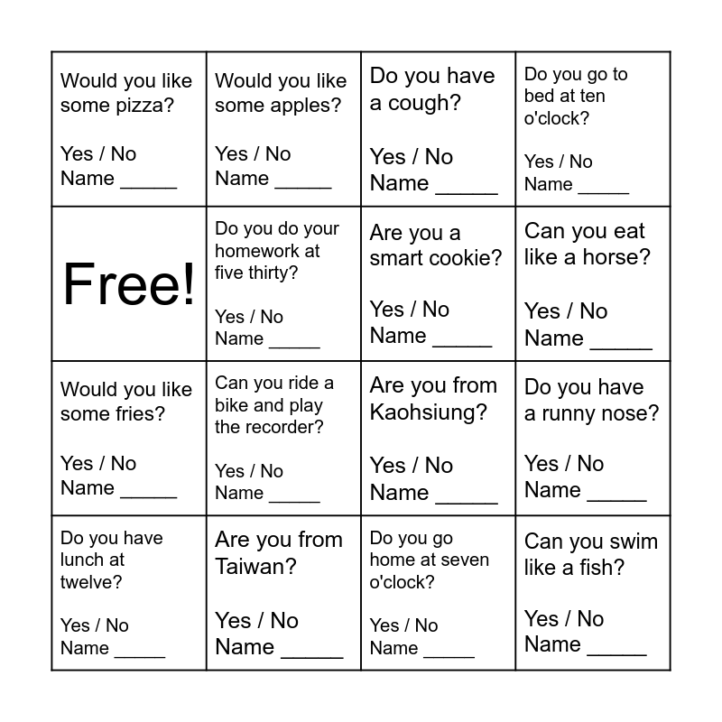 This bingo card has 16 words: Are you from Taiwan? Yes / No Name _____, Do you have a runny nose? Yes / No Name _____, Do you have a cough? Yes / No Name _____, Would you like some pizza? Yes / No Name _____, Would you like some fries? Yes / No Name _____, Would you like some apples? Yes / No Name _____, Are you from Kaohsiung? Yes / No Name _____, Do you go home at seven o'clock? Yes / No Name _____, Free!, Do you do your homework at five thirty? Yes / No Name _____, Do you have lunch at twelve? Yes / No Name _____, Do you go to bed at ten o'clock? Yes / No Name _____, Can you ride a bike and play the recorder? Yes / No Name _____, Can you eat like a horse? Yes / No Name _____, Are you a smart cookie? Yes / No Name _____ and Can you swim like a fish? Yes / No Name _____.