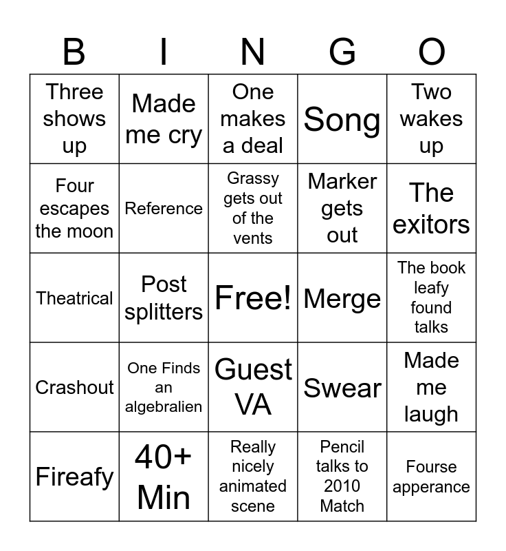 This bingo card has a free space and 24 words: One Finds an algebralien, 40+ Min, Grassy gets out of the vents, Fireafy, Two wakes up, Three shows up, Four escapes the moon, Made me cry, Merge, Guest VA, Marker gets out, Theatrical, Swear, Made me laugh, Reference, Pencil talks to 2010 Match, The book leafy found talks, One makes a deal, The exitors, Post splitters, Fourse apperance, Crashout, Song and Really nicely animated scene.