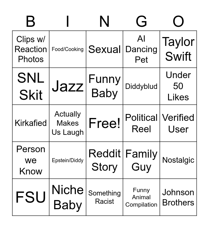 This bingo card has a free space and 34 words: FNAF, Funny Animal Compilation, Gay, Lebron James or The Rock, Person we Know, Jazz, Taylor Swift, FSU, Food/Cooking, Christmas Themed, Funny Baby, Sexual, Liked by Alyssa or Addison Traina, Christian Reel, Political Reel, Under 50 Likes, Niche Baby, Kirkafied, Epstein/Diddy, Family Guy, Reddit Story, Gameplay Under Video, Clips w/ Reaction Photos, Verified User, Something Racist, Johnson Brothers, AI Dancing Pet, Fart Sound, Diddyblud, SNL Skit, Stranger Things, Actually Makes Us Laugh, Nostalgic and TikTok Repost.