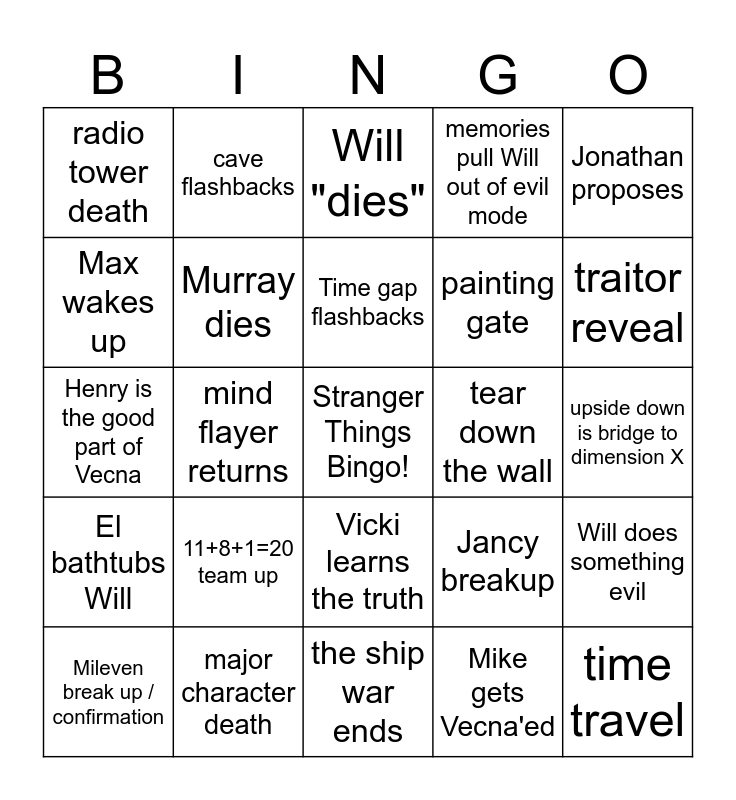 This bingo card has a free space and 24 words: 11+8+1=20 team up, major character death, Time gap flashbacks, Mileven break up / confirmation, Jonathan proposes, radio tower death, Max wakes up, cave flashbacks, tear down the wall, Vicki learns the truth, painting gate, Henry is the good part of Vecna, Jancy breakup, Will does something evil, Murray dies, Mike gets Vecna'ed, upside down is bridge to dimension X, Will "dies", traitor reveal, mind flayer returns, time travel, El bathtubs Will, memories pull Will out of evil mode and the ship war ends.