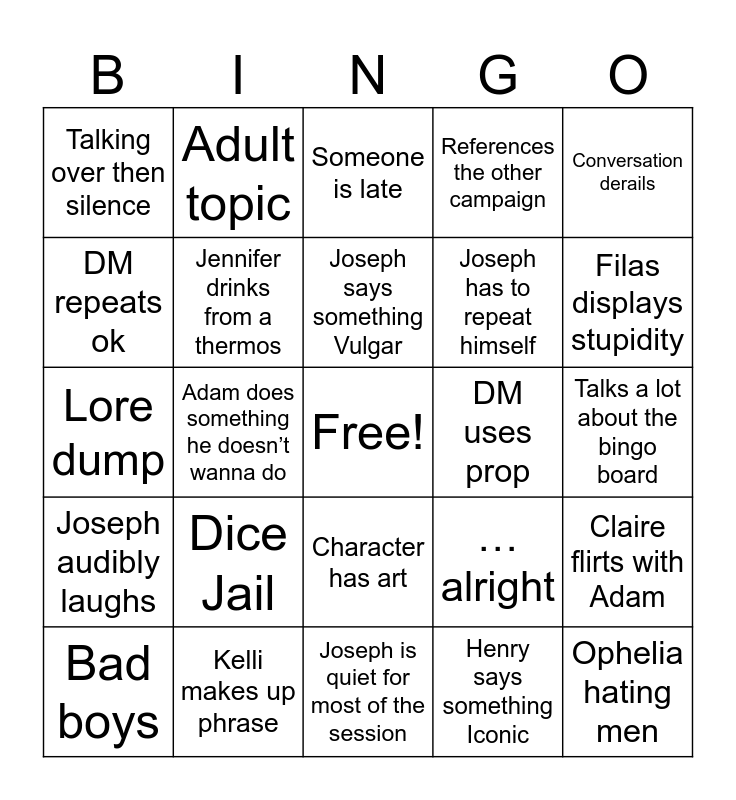 This bingo card has a free space and 24 words: Dice Jail, Kelli makes up phrase, Joseph says something Vulgar, Bad boys, Conversation derails, Talking over then silence, DM repeats ok, Adult topic, DM uses prop, Character has art, Joseph has to repeat himself, Lore dump, …alright, Claire flirts with Adam, Jennifer drinks from a thermos, Henry says something Iconic, Talks a lot about the bingo board, Someone is late, Filas displays stupidity, Adam does something he doesn’t wanna do, Ophelia hating men, Joseph audibly laughs, References the other campaign and Joseph is quiet for most of the session.
