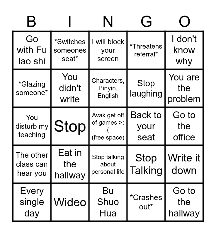 This bingo card has a free space and 29 words: Every single day, Domer ✅, Stop, Voice level 0, Go with Fu lao shi, I will block your screen, You didn't write, Eat in the hallway, Back to your seat, Wideo, Go to the office, Go to the hallway, Bu Shuo Hua, *Crashes out*, You are the problem, I feel disrespect, Stop talking about personal life, The other class can hear you, I don't know why, You disturb my teaching, Stop Talking, No games, Stop laughing, *Glazing someone*, *Threatens referral*, *Switches someones seat*, Write it down, Characters, Pinyin, English and You make the noisy.